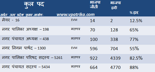 नगर पालिका परिषद् की ५२६१ सदस्यों की पदों पर भाजपा को ९२२ सीटों पर विजय